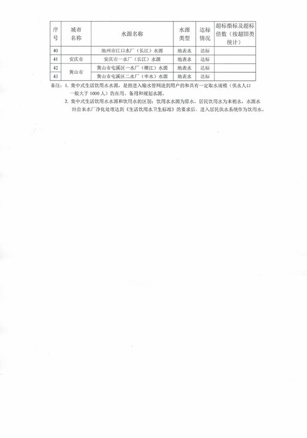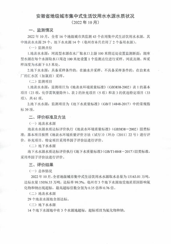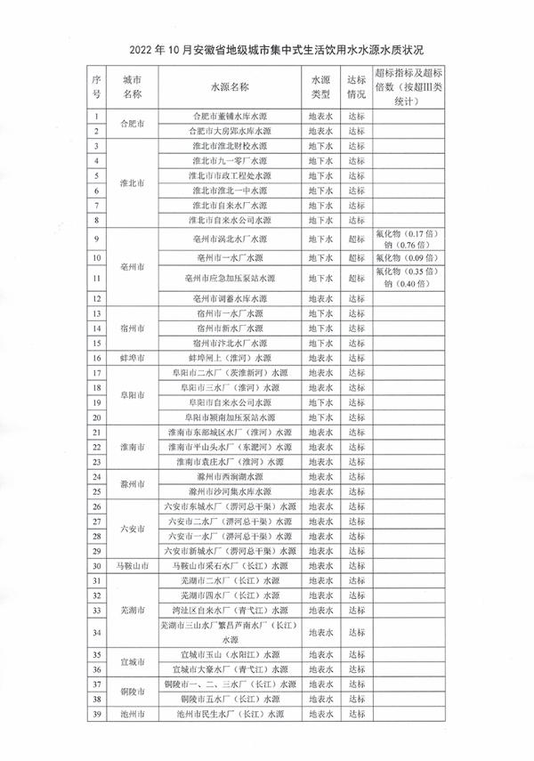 安徽省地级城市集中式生活饮用水水源水质状况(2022年10月)