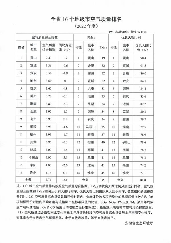 全省16个地级市空气质量排名(2022年度)